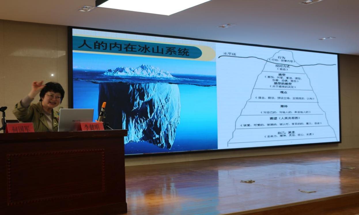 接着,李健明老师通过介绍心理学中的“冰山理论”,采用真实案例、手部动作演示等生动化的方式具体形象的向全体高二员工家长分析目前高二员工和家长所表现的行为以及在其行为背后所隐含的真实期待与自我认知。李健明老师表示,当家处在一个爱的氛围中,孩子期待渴望的最底层,是他们自己本身的生命力。处在高二的重要关键点,家长需要跟儿女进行有效沟通,表里一致,及时觉察孩子的情绪变化并给予及时的关爱鼓励,原生家庭对于孩子的成长过程至关重要,只有当孩子的自身感受、自身观点、自身期待、自身渴望被看见之后,最底层的生命力才会被看见、被激活、被赋能,以此提升孩子的自我价值感。